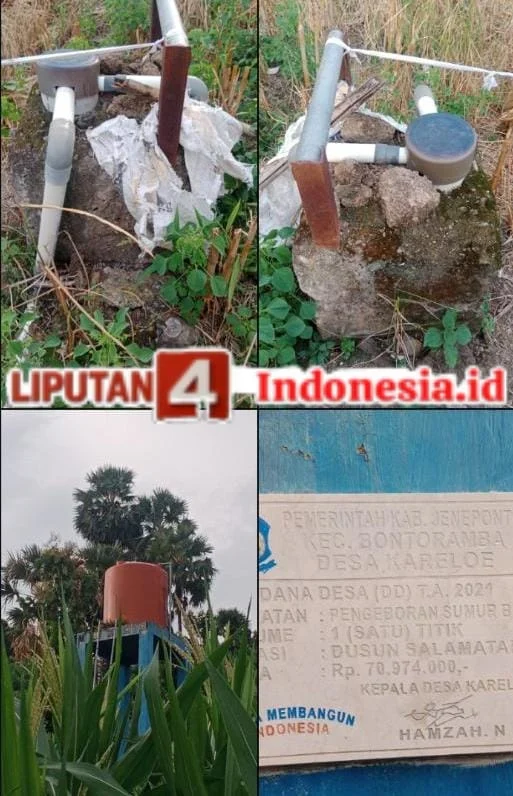 Jeneponto ~ Liputan4indonesia.id Senin .(12/April/2026) Pembangunan sumur bor dan bak tampung yang dibiayai dari Dana Desa (DD) melalui APBDes di kampung dusun salamatara desa kareloe kecamatan bontoramba kabupaten Jeneponto Sulawesi Selatan kian menguatkan dugaan adanya pelanggaran tata kelola pemerintahan desa yang Menjabat sebagai kepala desa kareloe inisial Hamzah. M 3 periode Selain banyak yang tidak berfungsi, proses perencanaan dan penganggarannya diduga tidak sejalan dengan regulasi yang berlaku.