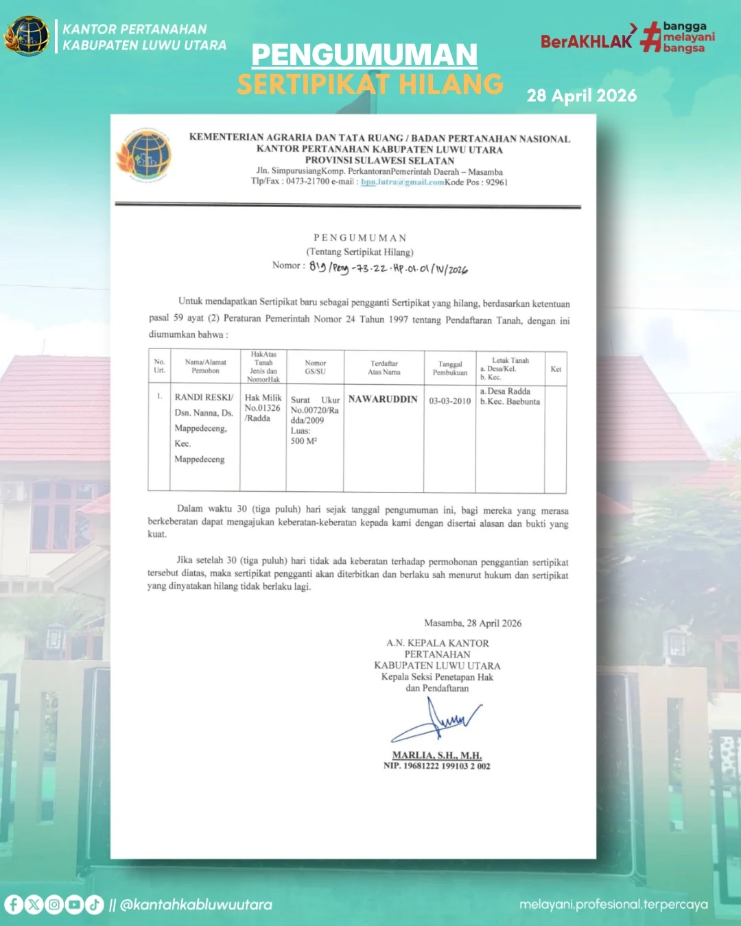 JAMIN KEPASTIAN HUKUM, KANTOR PERTANAHAN LUWU UTARA LAKUKAN PENGUMUMAN SERTIFIKAT HILANG