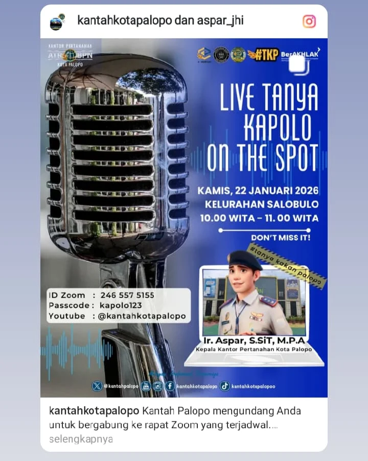 Acara akan digelar pada Kamis, 22 Januari 2026, pukul 10.00 WITA hingga 11.00 WITA, baik secara langsung di Kelurahan Salobulo maupun secara daring melalui platform Zoom dan YouTube. Narasumber utama adalah Ir. Aspar, S.SiT., M.P.A., Kepala Kantah Kota Palopo.