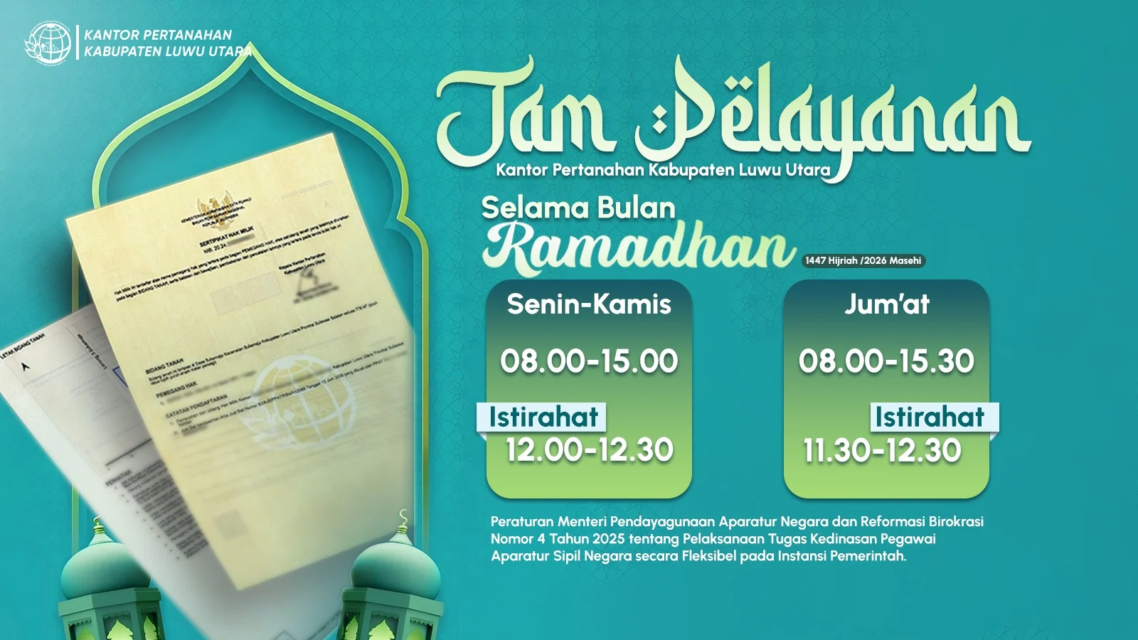 Berdasarkan ketentuan tersebut, jam pelayanan pertanahan selama bulan Ramadan di Kantor Pertanahan Kabupaten Luwu Utara ditetapkan sebagai berikut: