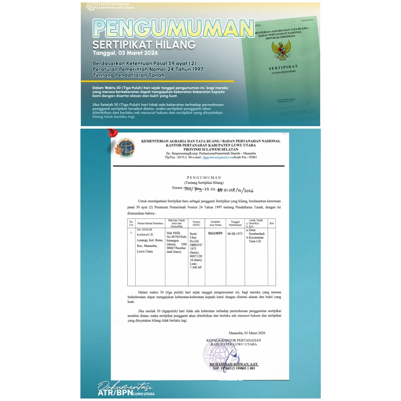 Luwu Utara – Liputan4.id-Dalam rangka menjamin kepastian hukum hak atas tanah dan menjaga tertib administrasi pertanahan, Kantor Pertanahan Kabupaten Luwu Utara menyampaikan pengumuman kepada masyarakat terkait sertipikat hak atas tanah yang dinyatakan hilang sebagai bagian dari proses penerbitan sertipikat pengganti. Selasa, 03 Maret 2026.