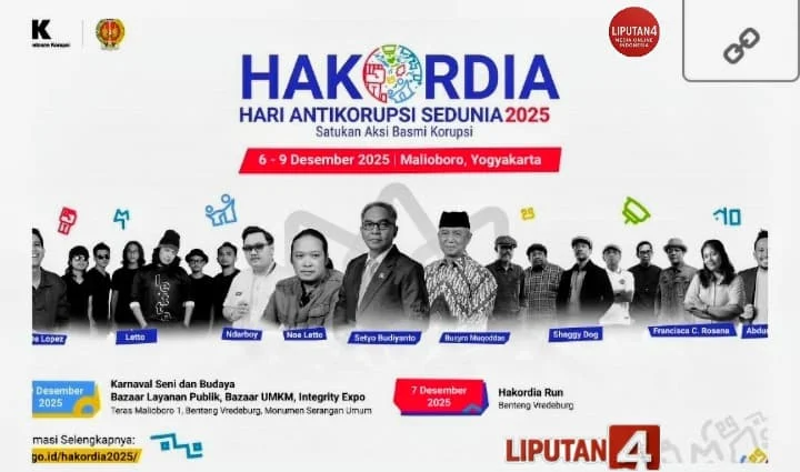 Jakarta ~ Liputan4indonesia.id Senin (08/ Desember/2025) Komisi Pemberantasan Korupsi (KPK) resmi mengumumkan gelaran Hari Antikorupsi Sedunia (HAKORDIA) 2025, sebagai gerakan kolaborasi nasional yang akan diselenggarakan di Daerah Istimewa (DI) Yogyakarta, pada 6-9 Desember 2025 mendatang. Alih-alih sekadar seremoni, dengan mengusung tema “Satukan Aksi, Basmi Korupsi,” HAKORDIA 2025 dirancang sebagai ruang inklusif selama empat hari penuh.